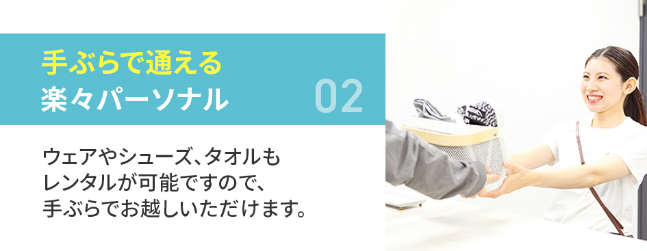 ウェア・シューズ・タオルは無料レンタルができるため、手ぶらでお越しいただいて構いません。