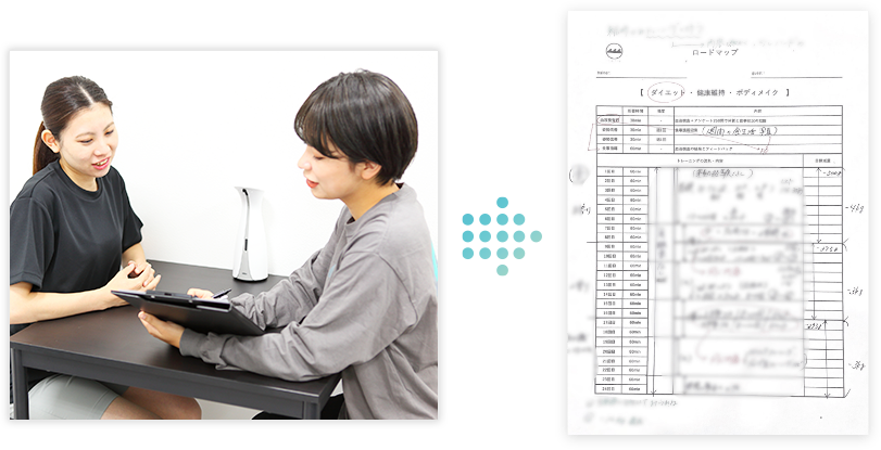 ヒアリングさせていただいた内容を基に、いつまでに〇kg痩せて、どのようなトレーニングを行うのかを細かく設定したロードマップを作成します。