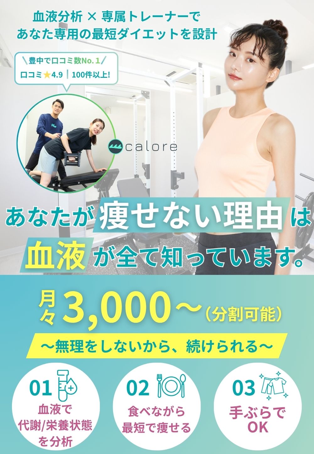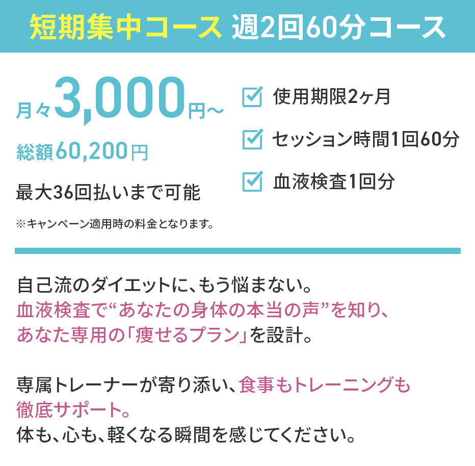 大丈夫です!失敗の原因を見つけ出し、あなたに合った最適な方法を血液検査、科学的根拠に基づいたトレーニング方法、ダイエットロードマップを用いてダイエット成功に導きます!