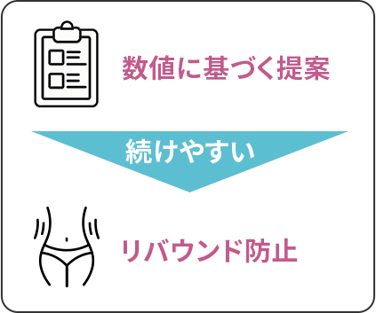結果はすべて専属プランナーと共有し、体質に合った食事・運動を提案。数値に基づいた指導だから続けやすく、リバウンドのリスクも最小限に抑えられます。
