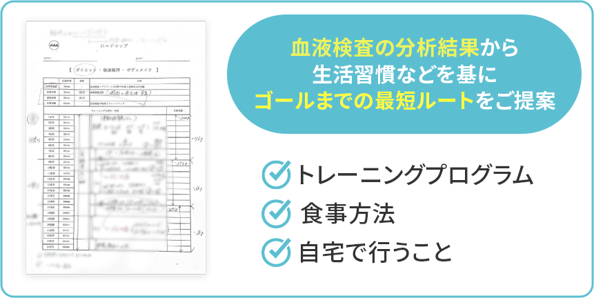 遺伝子検査が“将来のリスク予測”なのに対し、血液検査は“いま現在の体の状態”を映し出します。だからこそ、すぐに役立つ具体的な食事改善やトレーニング提案が可能です。